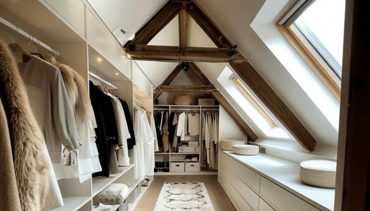 - Wall-mounted folding ladders or staircases with built-in drawers save space