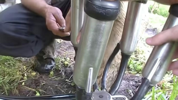 Correct Incorrect Dairy farmers typically use milking machines to extract milk from cows, but they can also work with sheep and goats. You can think of a milking machine as a large breast pump that uses a vacuum, teat cups, and a pulsating system to collect milk into big vats for processing later.