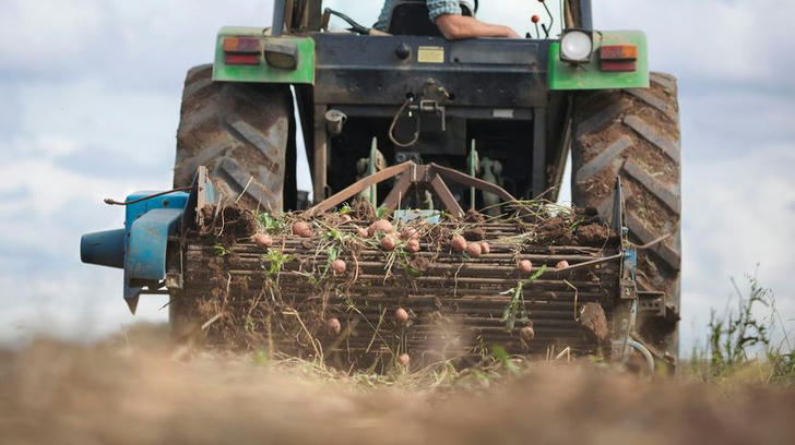 Correct Incorrect A potato harvester resembles a tractor and is used by farmers to pull up potatoes from the ground. It sifts out soil and rocks using a sieve, collecting the potatoes into a bin for later processing.
