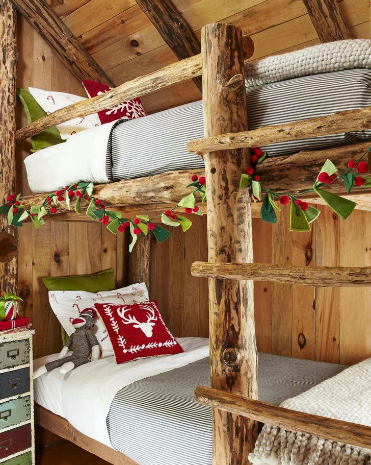 My two daughters love this bed and feel like they’re sleeping in a forest. This rustic bunk bed, made of natural wood, adds a bit of woodland charm to the space. The bedding fits the Christmas season as well. They personally picked the green felt leaves and red berry wreath for their beds.
