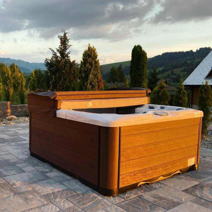 The outdoor wooden hot tub offers a truly relaxing experience, nestled in nature's embrace. Surrounded by fresh air and the soothing sounds of the outdoors, it’s the perfect spot to unwind after a long day. The rich wood contrasts beautifully with the surrounding landscape, creating a serene retreat where warmth and tranquility meet.