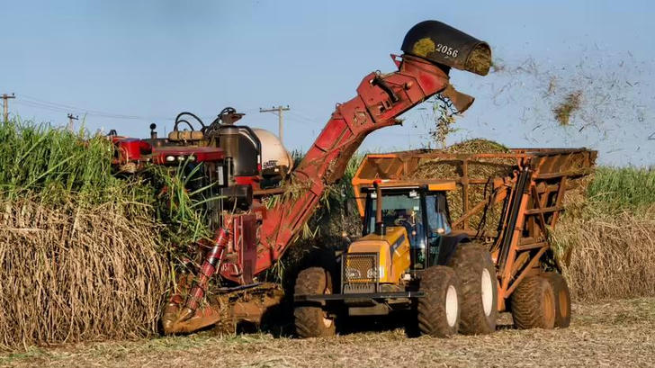 Correct Incorrect A sugarcane harvester combines several reaping steps: it cuts the stalks near the ground, strips the leaves, and chops the stalks into smaller pieces. Some models store the cut pieces, while others transfer them to a second vehicle.